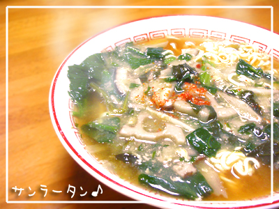 サンラータンスープは昨日、レシピ本を見て作ったものの残りです。